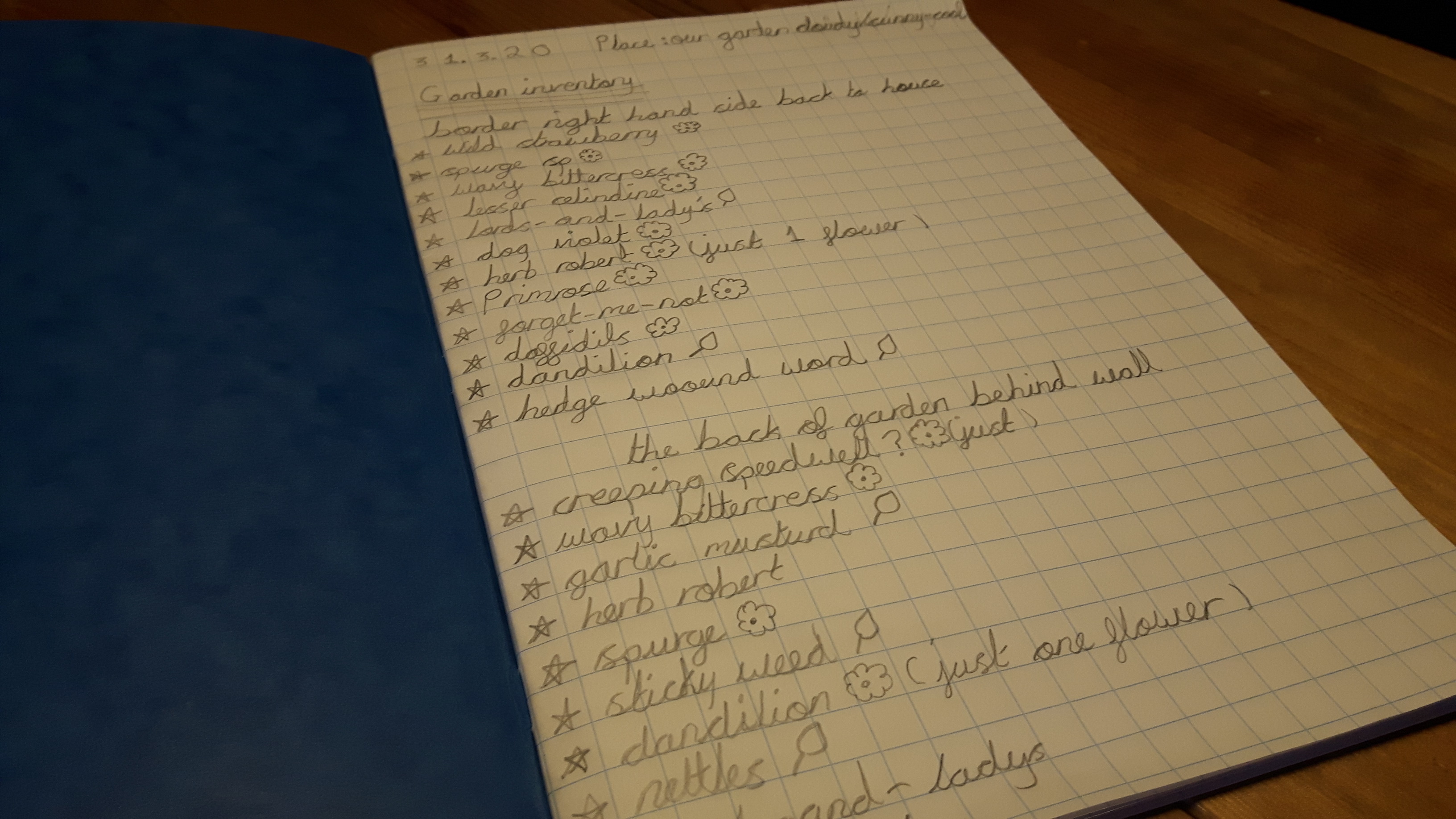 - You can try and make an inventory of your garden with all the plants you can find/identify. Record if they are in leaf or in flower. What else can you discover? Are there any birds’ nests, minibeasts, amphibians, night time visitors…?