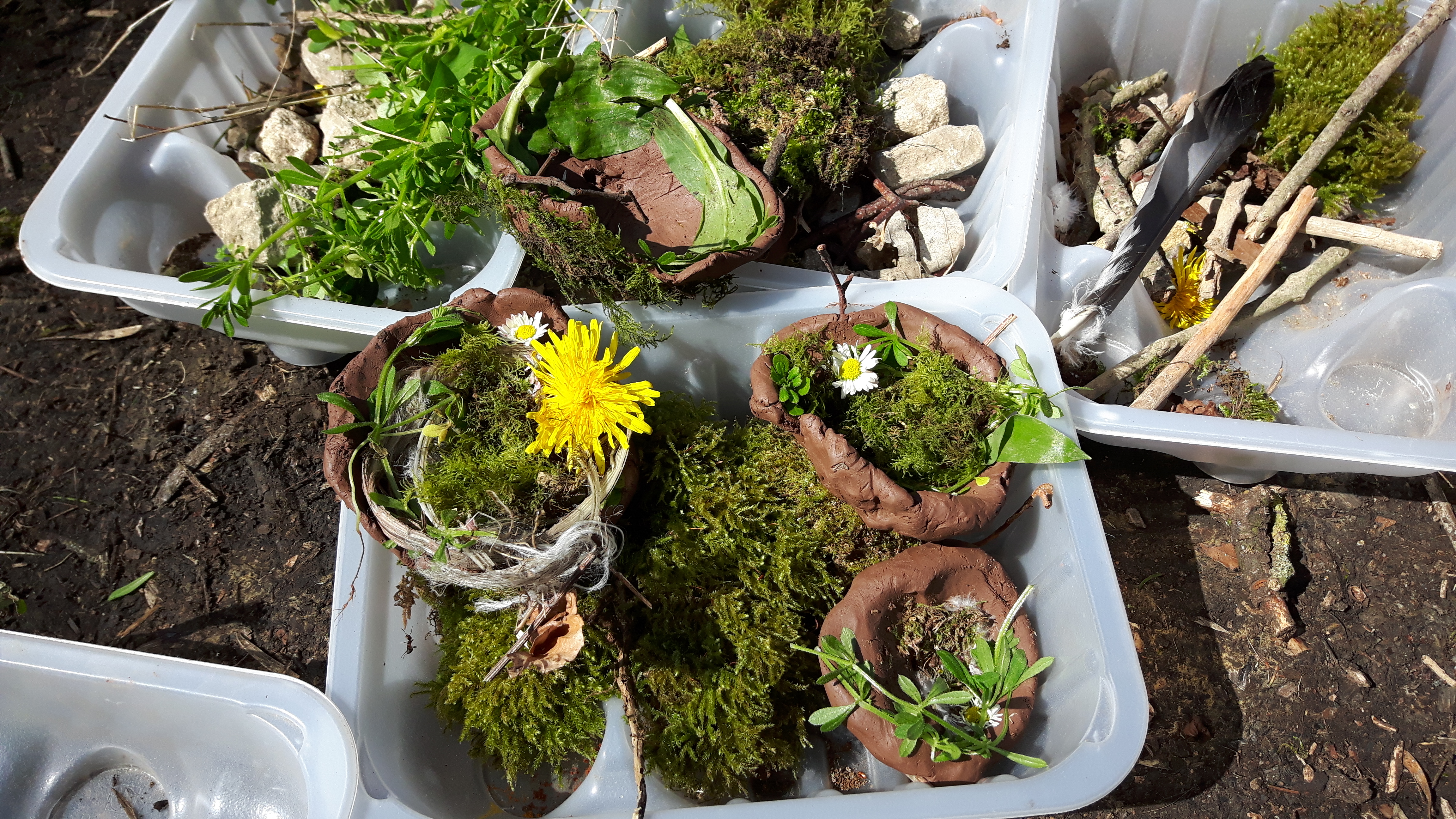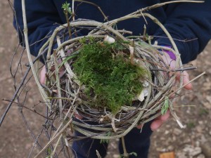Sticky weed, also known as goosegrass or cleavers, is growing prolifically. Due to its stickiness, long strand can easily be shaped into a nest which can then be decorated. It won’t last long as the sticky weed will wilt but is quick and pretty.