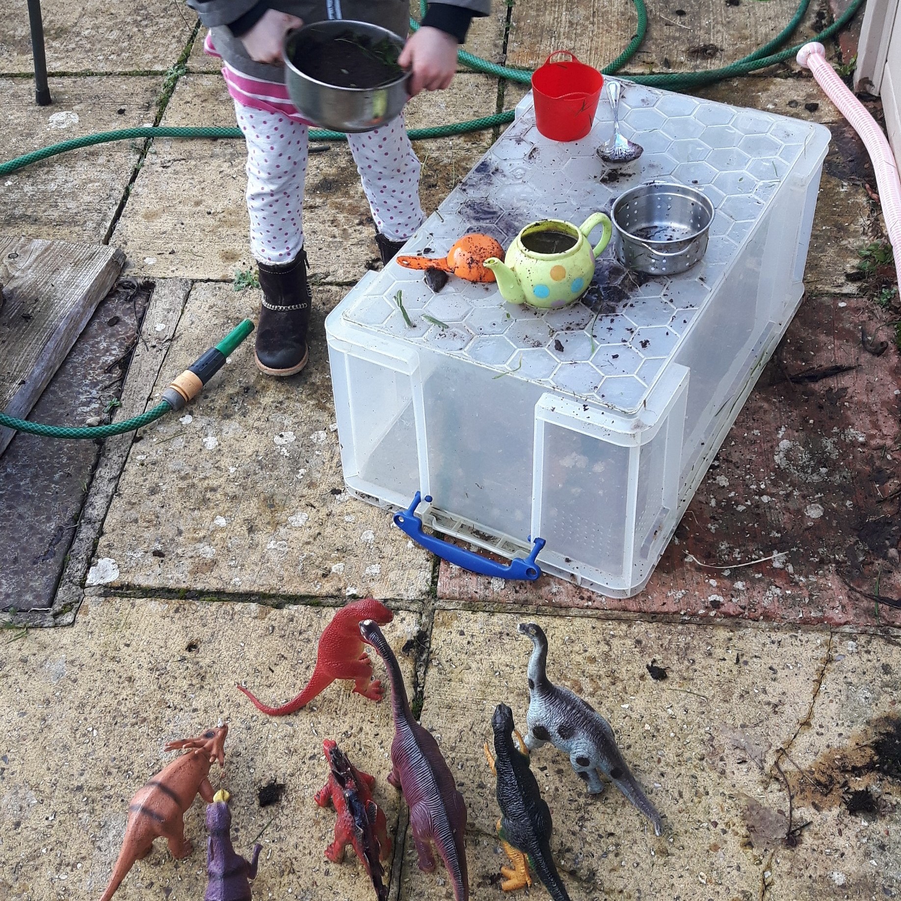 - Make lunch in the mud kitchen and invite some dolls for a picnic